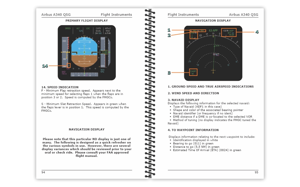 The A340 Quick Study Guide (QSG) is a handy 5.5″ x 8.5″ (14 cm x 21.6 cm) reference guide for pilots looking to familiarize themselves with the locations and functionalities of all the A340 cockpit controls and indicators.