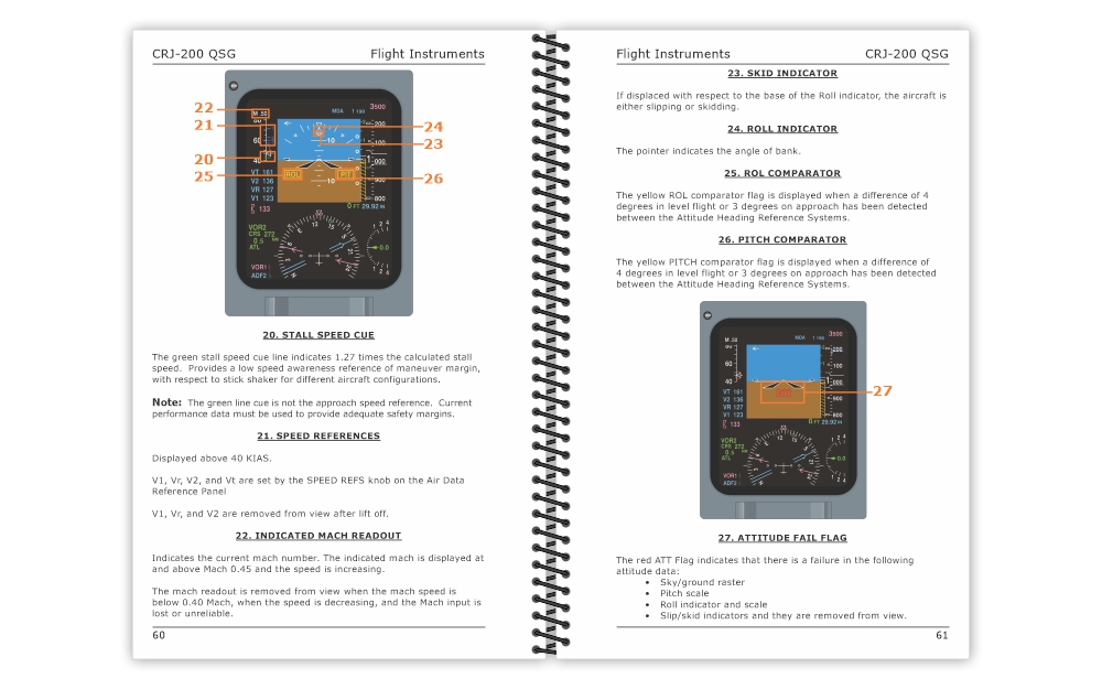 The CRJ-200 Quick Study Guide (QSG) is a handy 5.5″ x 8.5″ (14 cm x 21.6 cm) reference guide for pilots looking to familiarize themselves with the locations and functionalities of all the CRJ-200 cockpit controls and indicators.