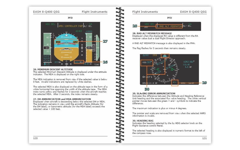 The Dash 8 Q400 Quick Study Guide (QSG) is a handy 5.5″ x 8.5″ (14 cm x 21.6 cm) reference guide for pilots looking to familiarize themselves with the locations and functionalities of all the Dash 8 Q400 cockpit controls and indicators.
